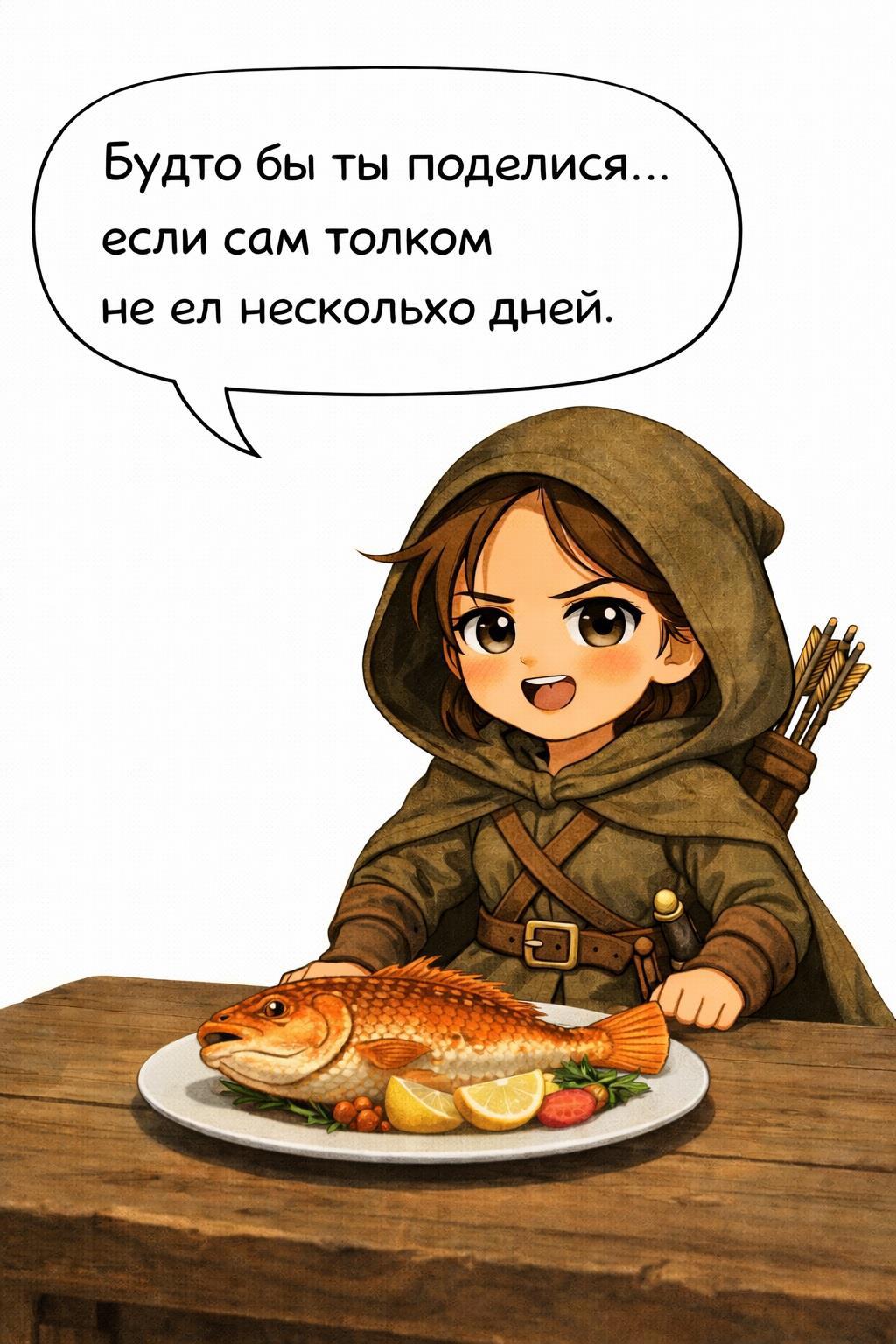 Кайден в это время медленно опускал деревянную ложку с выцветшими узорами в тарелку с похлёбкой, густой, как тот лес, через который они недавно пробирались. Хлеб на столе был не чёрствый, а мягкий и тёплый — всё, о чём они не могли мечтать ещё пару ночей назад.