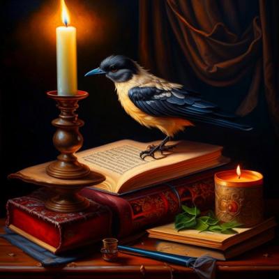 О, нашел вторую птичку, переложил в другую папку и не сразу нашел - она и к врановым немножко ближе и книги ей близки, пусть больше не имеет связи напрямую, но вполне может быть фамилиаром :)