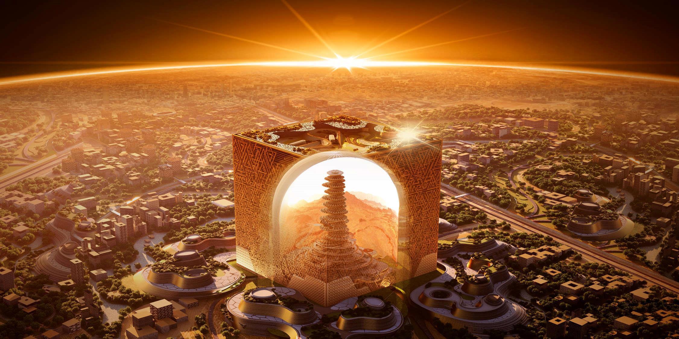 Саудовская Аравия, проект Mukaab. Станет одним из самых больших зданий в мире. Сверхвысокий куб (400 метров), может вместить целых 20 зданий, подобных Empire State Building.