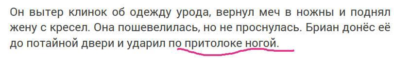Крут, однако, Бриан! С мечом (определенно не стограммовым) на поясе и беременой женой на руках ухитриться ударить ногой по верхнему (выше головы) брусу двери! Джеки Чан отдыхает.