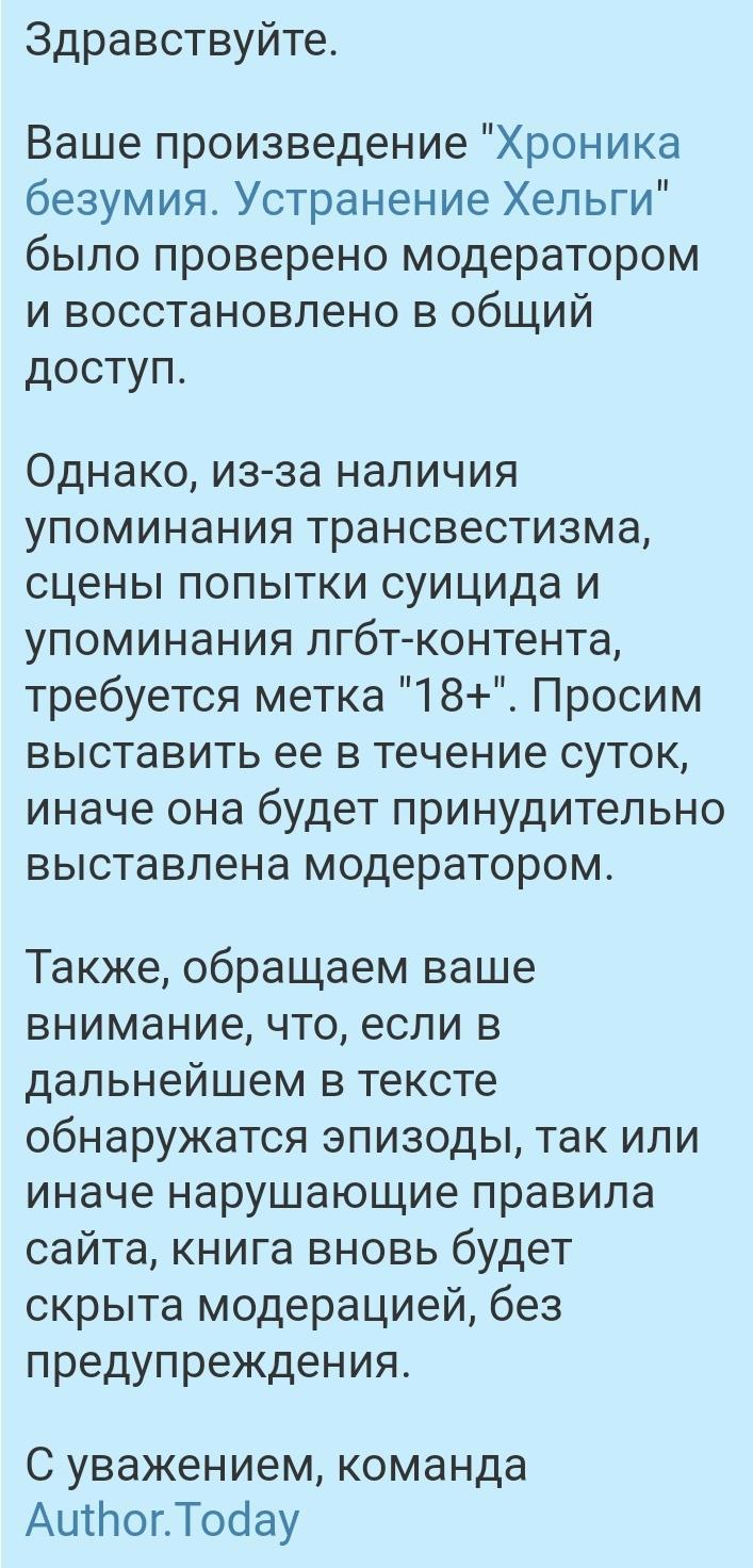 Эврика! Я обсудил некоторые вопросы со службой поддержки и решил, что на автор.тудей и в других российских ресурсах планирую переписать Хронику Безумия, которая не будет противоречить законодательству РФ.
