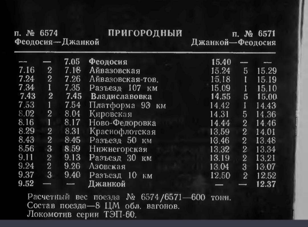 Вот на счёт электрички от Джанкоя до Керчи в 1970 году автор несколько (лет на 50) погорячился. Пригородные - да, а вот "шнурка" и сейчас от Джанкоя до Керчи нет - там РА2 ходят. А в 70-е там ходили пригородные поезда из 6-8 цельнометаллических областных (сидячих) вагонов под ТЭП-60 и не факт, что Джанкой-Керчь прямые были (нашел только расписание за 1991 год, там с пересадкой Джанкой-Владиславовка-Феодосия либо Джанкой-Владиславовка и отдельный Владиславовка-Керчь).