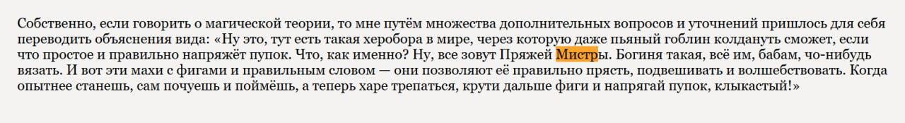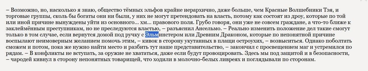 Это буквально лёгким поиском по тексту в первых томах. Я понимаю, что "Ой, да Визардам насрать на РФ, пока ты не зашибаешь миллионы", но давайте будем последовательны. OGL есть OGL, и мне самому больно от осознания, что придётся заниматься переименовыванием всего нарушающего в оригинальном произведении, когда я задумаюсь над его публикацией за денежку, но... Лучше, кмк, перестраховаться на случай, если кому-то станет вдруг не насрать в достаточной степени, чтобы раздуть истерию и поднять волну говен, и привести текст в соответствие с лицензией.