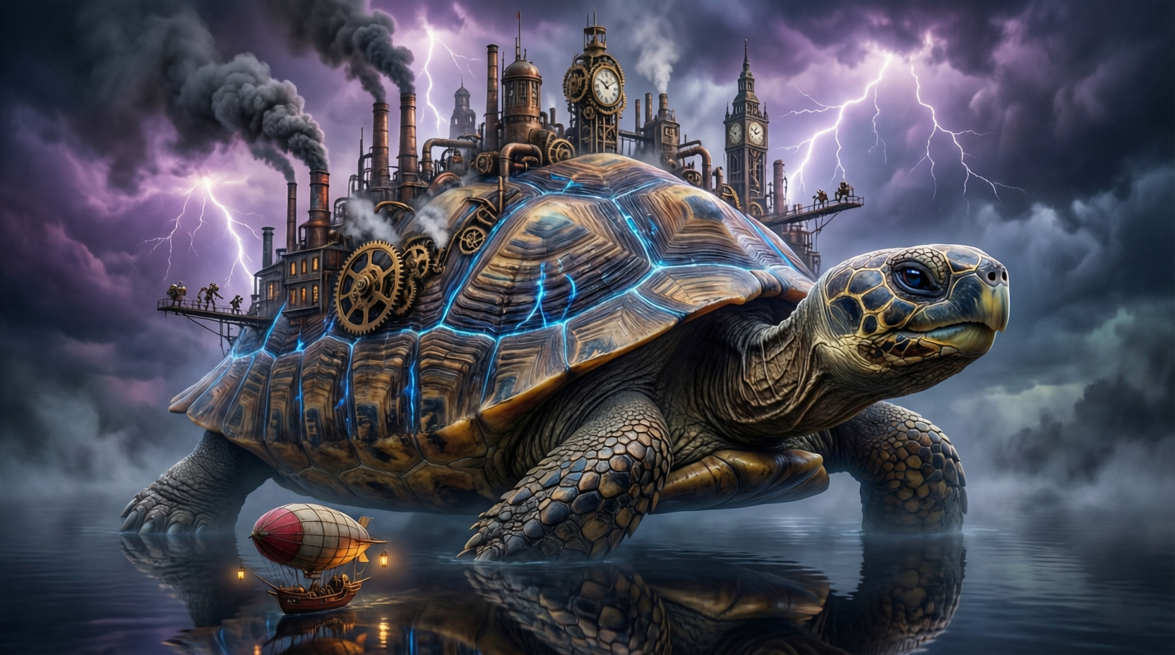 Результат получился близкий к тому, что было задумано. А вот квен, к сожалению, упорно рисует на панцире несколько Биг Бенов с кучей шестерёнок