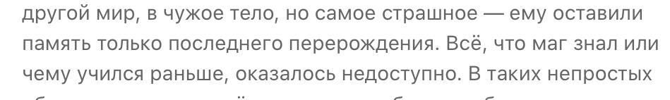 Я еще читать не начал, но сразу вопрос возникает, а собственно, сам факт того, что в прошлом перерождении он все свои прошлые знания хотя бы разок вспоминал (исходя из описания продолжал планы свои) , тем самым закрепляя за этим перерождением знания обстановки, магии, инфы житейской, не считается? я просто не догоняю как можно отнять память предыдущих перерождений оставив последнее, где он опять же все прошлые знания использовал и соответственно помнил и которые должны по сути перейти сейчас к нему, крч по сути он ничего не теряет, парадокс.