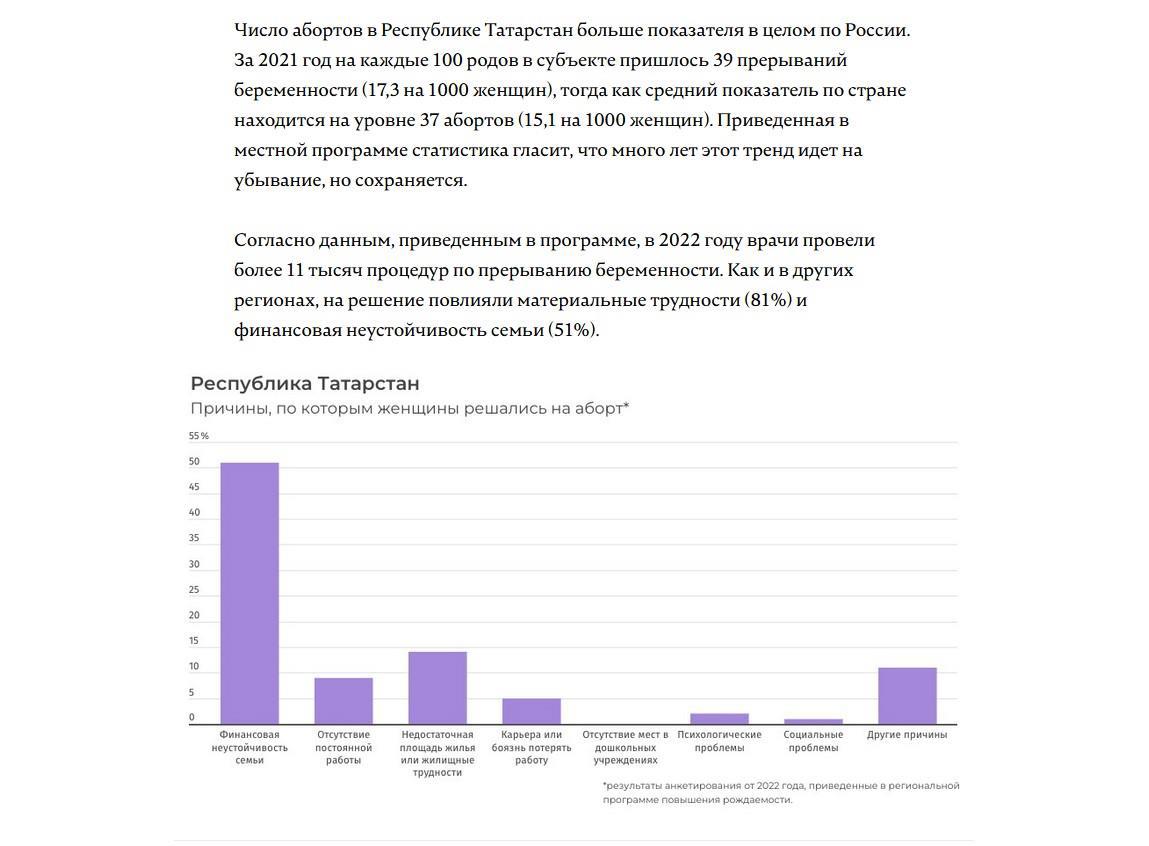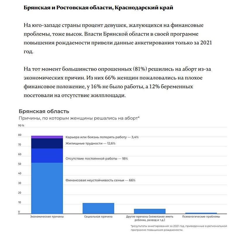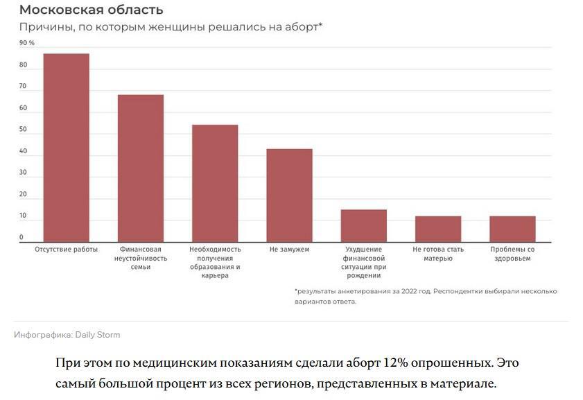 К сожалению, доступная статистика подтверждает мои слова. Да, остальные причины (кроме медицинских показателей, которые задокументированы в лечебных учреждениях) взяты со слов самих женщин, которые анкетировались после принятия решения на аборт. Но сравните количество по медпоказаниям и остальные (в некоторых графиках медпоказания входят в "другие причины". Вот выборка по нескольким регионам: