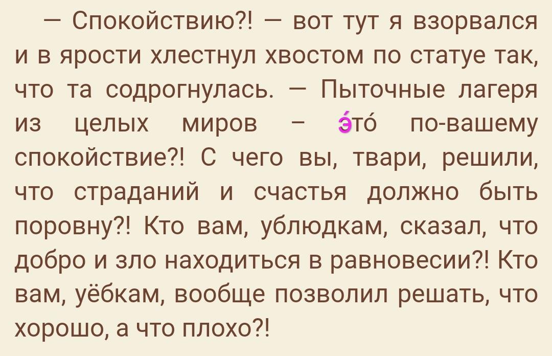 Я понимаю почему переделали реакцию легата, но не понимаю, зачем нужно было показывать Аргалора таким вспыльчивым в этот момент. Он пусть и красный дракон, но всë же у него человеческий(почти) разум. Он ведь тренировался сдерживать свою драконью натуру. Да и как цветной дракон что может держать под контролем и использовать в своих целях всю драконью ярость - слишком он быстро вспылил.