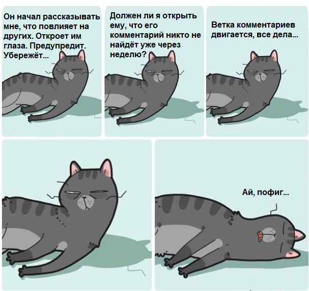 Знаете, ваш комментарий это просто кладезь офигенных юморесок, начиная от жалоб на то, что гнусный Седрик посмел порофлить с чужой попаболи на его личность и вообще, гад такой, умет пользоваться функционалом открытой площадки, где каждый может ответить каждому. Но хотя все они могли бы сделать мой день, больше всего мне нравится, что вы сами признаёте, что именно я тут смешиваю с грязью, а не наоборот, несмотря на все ваши усилия. Так сказать, оговорочка по Фрейду. И самое забавное, что пока вы не перестанете быть обиженками, действиями которых руководит жаждущий хоть как-то задеть "страшного ворога" пригоревший "тыл", ничего не изменится, и вашим потолком так и останется жаловаться на то, что вот вы ссытесь зайти ко мне на страницу и так же повыгибать пальцы в мой адрес, как делаете это тут под защитой свой "стаи", а я не ссусь даже на вашей площадке мешать вас с грязью под ваши бессильные истерики.