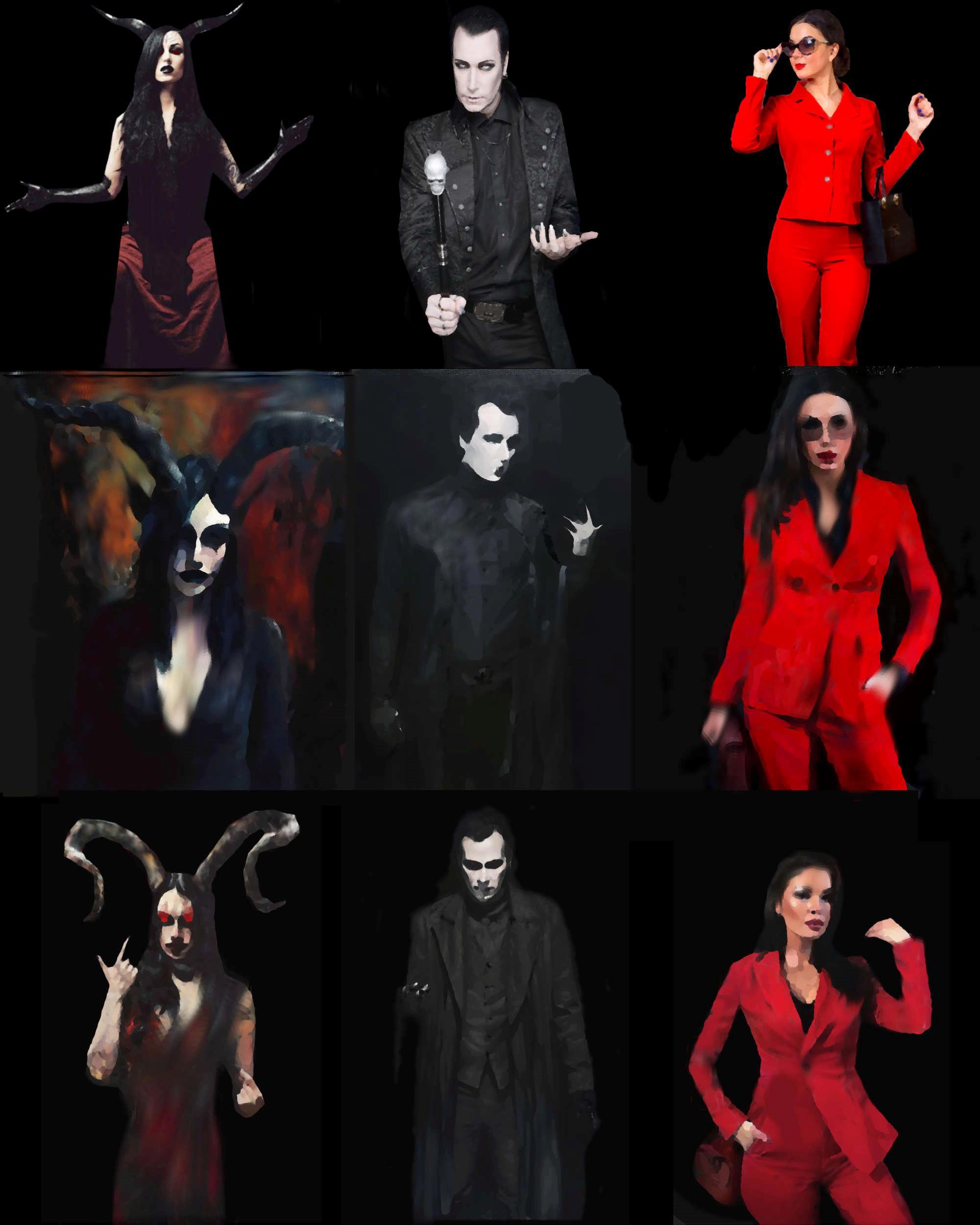 Первый ряд: фото взятые за основу с небольшой обработкой. Второй ряд попытка сделать эскизы персонажей. Третий ряд почти готовые эскизы персонажей. В качества фона взял фото одного из заведений Челябинска, убрал некоторые объёкты, добавил другие объекты и все это обработал через фильтр. Все этапы скидывать не буду, а то получится огромная портянка =(