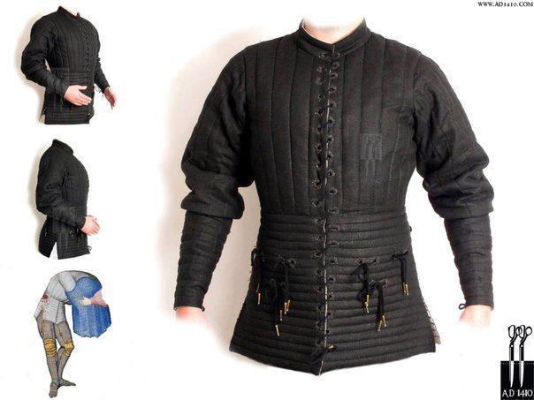 1) Доспехи носят поверх стёганной защиты, амортизирующей удар. Судя по доспеху там должен быть гамбезон конца 14 или 15 века.