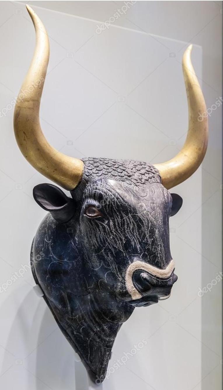 Ритон в виде головы быка из Кносского дворца. Камень (чёрный стеатит), горный хрусталь, яшма, золото, белые раковины. Минойская цивилизация (культура) 1600–1450 гг. до н. э.