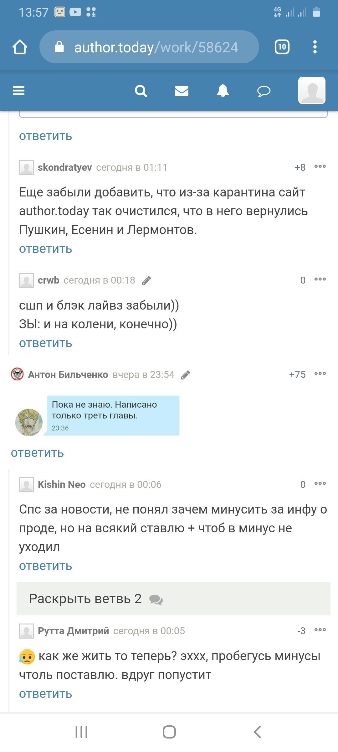 Сижу читаю комменты а глаза на лоб лезут. Сидят тут все такие диванные эксперты, и упрекают Николая, что диалог вата, глава на последнем издыхании и так далее. А вам не кажется, что вв своим нытьем пррсто напросто сбиваете с мысли. Где прода это самый главный коментарий постоянно. Который довольно сильно капает на мозги автору. Написать книгу это вам не коммент настрочить, тут муза нужна. Мне глава понравилась согласен что мало диалогов было( лишь тот что в конце) но глава была направлена на боёвку и писать что то большее было розтягивать главу и время её написания. А попробуй тут розтянуть когда на мозги капают свои где прода. Николай не слушайте никого, если нету музы и надо отдохнуть берите отдых, не нужно загоняться, мы подождем)))