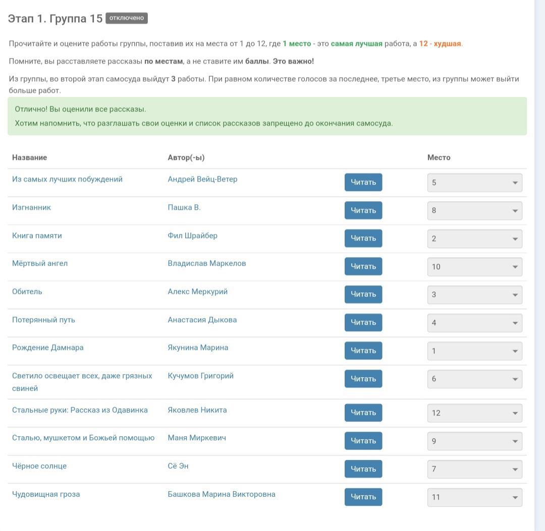 Все! Всем поставила оценки! Первые 4 места было не сложно, как и 12))) ну а дальше уже сугубо субъективно. Написала короткие отзывы отдельно в док, после завершения самосуда сделаю блог. Все, дело сделано.