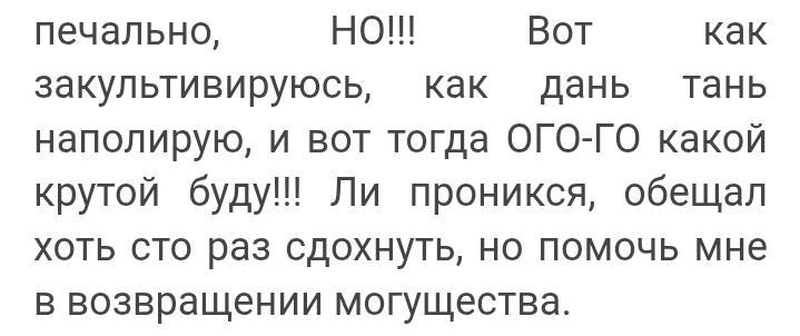 Кстати, надо бы ГГ упраждения новые, потяжелее. А то от придыдущих уже не будет особо толку. Нужно бегать и присидать с бревном например, и для укрепления рук махать молотом. Или он может попросить товарища культиватора комплекс придумать. Или задания там, тренировки в стиле СИЛЫ ЮНОСТИ, хотя не, сейчас это его убъёт.