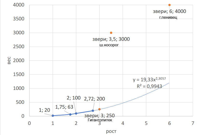 Инфографика по вашей статье, добавил 2 цифры: https://www.rbc.ru/life/news/659f91819a7947541f560e84 отсюда гигантопитека и нормальный вес для человека ростом 1,75м. Получается что в рамках "гоминидности" 5м/800кг. Понятно что это предположение, да и что первично для веса гигантопитека - этот график или исследования - тот ещё вопрос :) но тем не менее он "на линии". Носорог и ленивец - т.к. для остальных нет пары рост/вес в тексте.