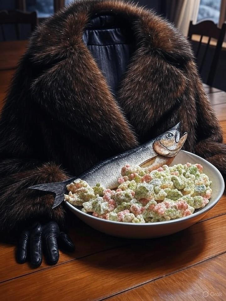 Попросил ИИ нарисовать мне салат оливье и селёдку под шубой. Про салат ИИ понял, а вот селёдка под шубой...![]()