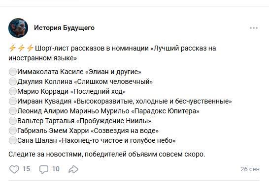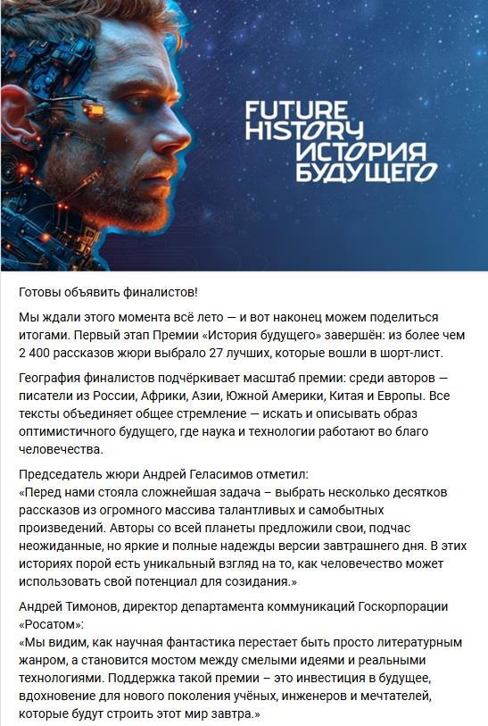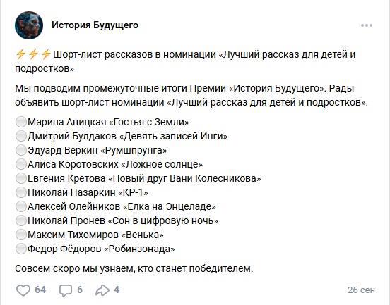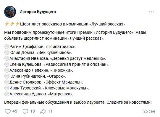 Я смотря как расхваливали члены жюри мировых столпов фантастики. И что в группе ВК публиковали. То для них фантастика 20хх это как частнок для вампира. Не одного современного писателя фантаста не было озвучено.