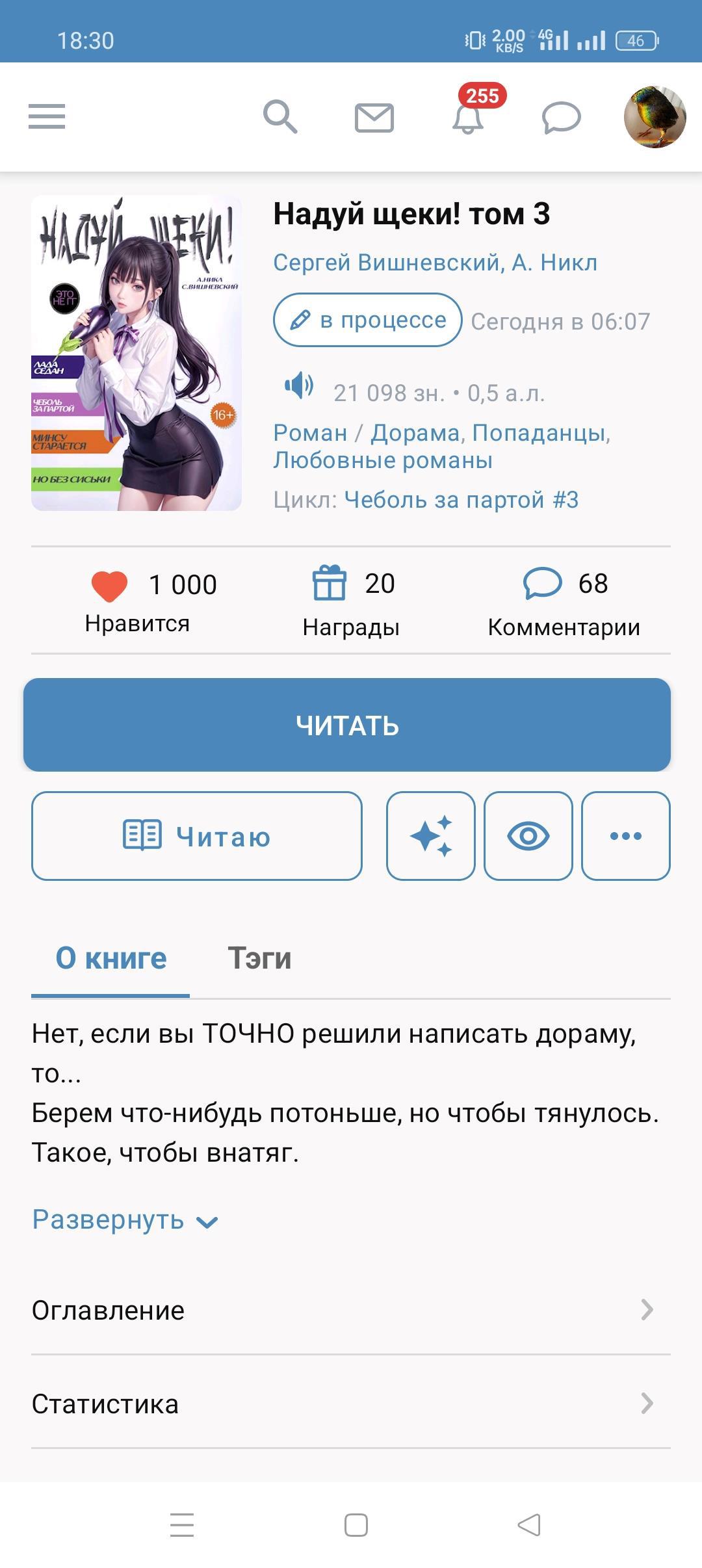только что листал ленту тик тока, и нежданно-негаданно наткнулся на видео, в котором автор позволяет наблюдать, как он ставит точкув написании данного цикла, если я правильно понял. никогда бы не подумал, что тик ток приведет меня сюда) обычно я ищу книги здесь, не велась на рекламу, но да неважно. видео мощное, и вскоре я хочу заценить плоды шестилетнего труда автора. ай, мужчинский)