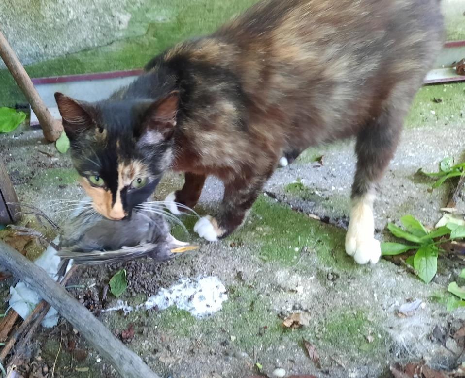 Я не могу на это повлиять. Пушка не домашняя кошка, я даже не знаю где ее логово, возможно у нее там даже есть котенок. Она однажды пришла к нам на порог и с тех пор приходит каждый вечер. Мяукает, но больше не затем что бы ее кормили, а что бы гладили. Ошейник от блох на ней не продержался и часа. Кошачий корм ест очень неохотно. Однажды мама сказала ей, что мяса совсем нет совсем-совсем, и она в тот же вечер притащила хомяка, это было так неожиданно, и приятно, мы стали ее прайдом)). Она теперь каждый день таскает хомяков, этот скворец единственный из птиц кто ей попался, может потому, что остальные скворцы достаточно агрессивны, я как то видела как они нападали на соседского кота. Дикая природа, хоть и совсем рядом, выживают сильнейшие.