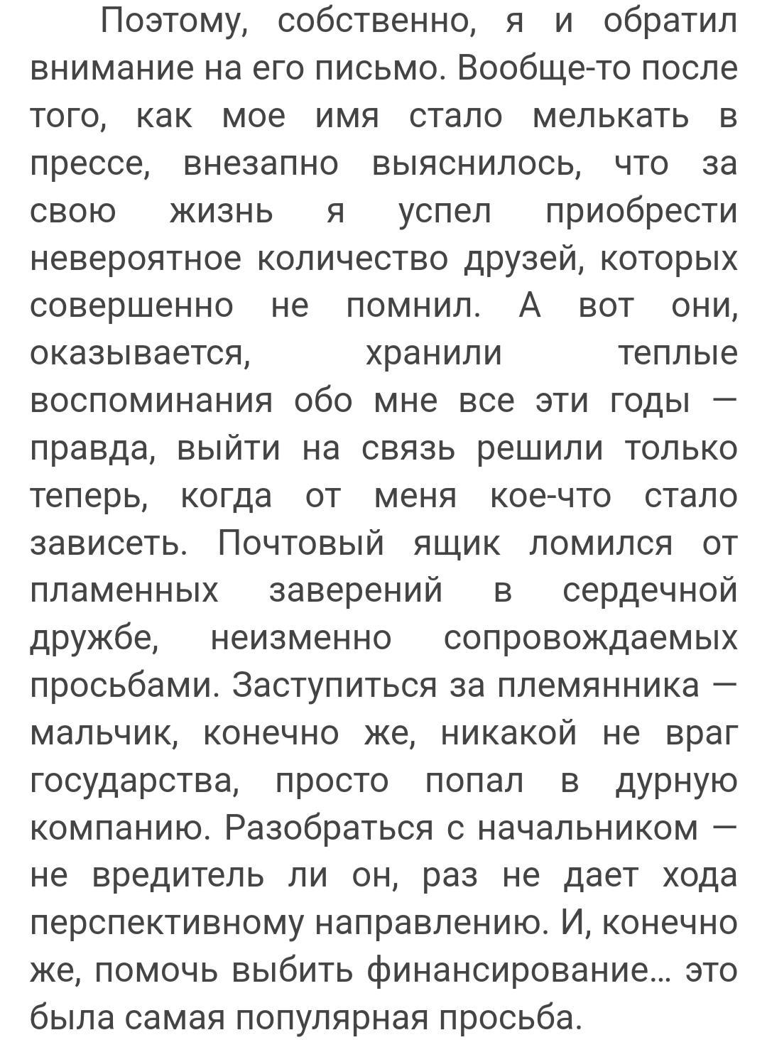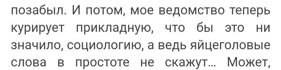 Кстати, забавно будет (не для Кастета), если выяснится, что Ботан - не только неплохой исследователь, но еще и внештатный лектор в столичном университете ("уверенный тон опытного лектора") и автор пары-тройки учебников (о чем Кастет, не читавший досье, не в курсе), и завтра к в Минобр отправится ректор университета, а послезавтра министр образования, принадлежащий к фракции противников Кастета, озвучит историю со всеми неприятными деталями на планерке у Самого. Вот не факт что с вопросами Самого удастся разобраться, если так подставившегося Кастета будут целенаправленно топить...