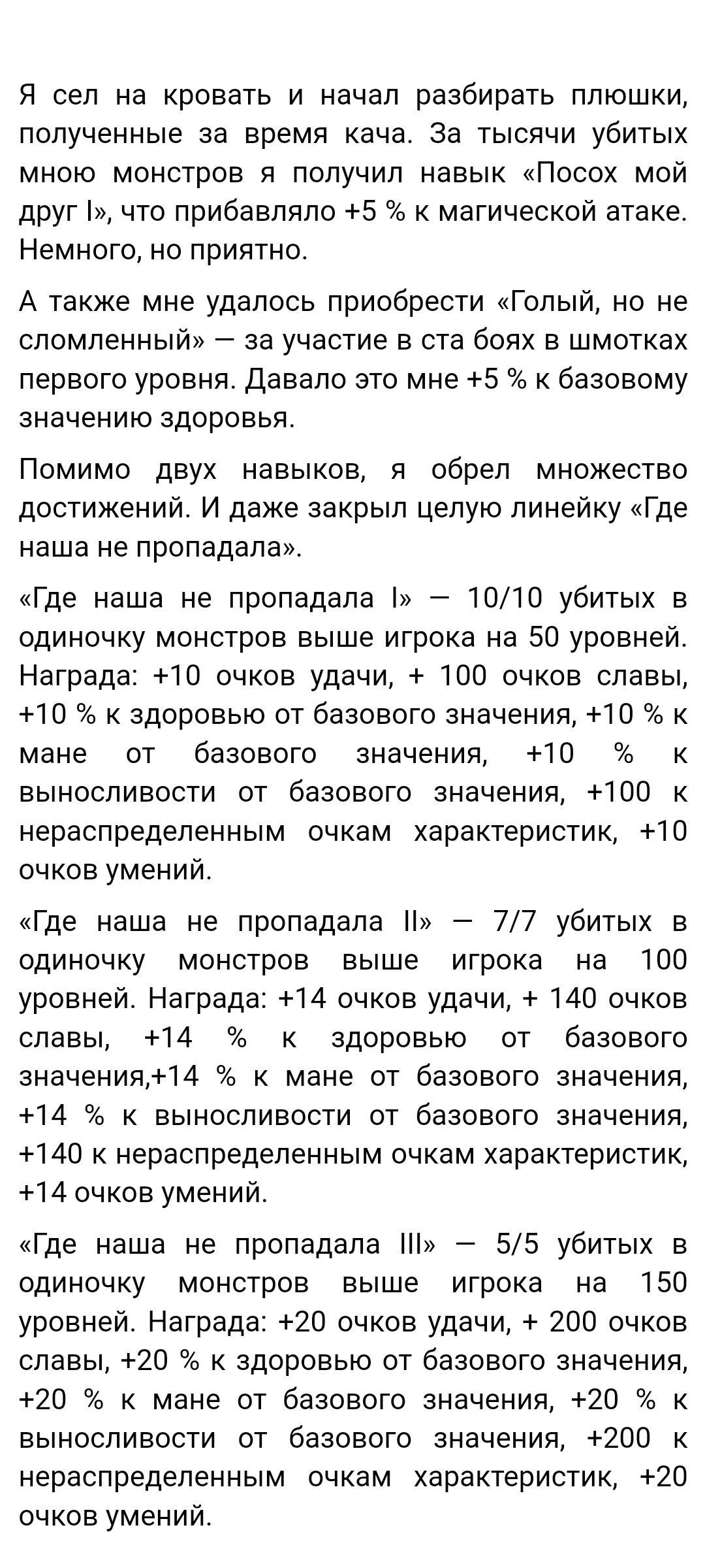 Доброго времени суток, хотел бы спросить у автора, неужели нельзя было достижение уровни и всё остальное касаемо лвл апа героя написать жирным шрифтом и в столбик, как обычно. Блин, фиг разберешь, честно портит удовольствие от чтения.