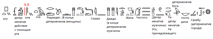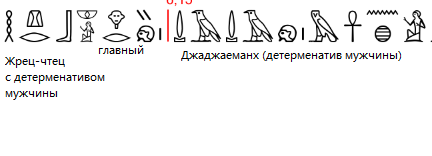 Обратите внимание, что здесь инверсия. Знак (флажок или топорик) бога стоит перед знака слуги (дубинка), так как имя бога писалось всегда впереди, но грамматически правильно позади (точно така же инферсия в слова Тутанхамон, которое записывается Амонтутанх, так как имя Амона ставится вперёд).