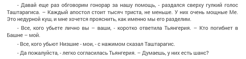 Вопросы здравомыслия. Кор считает 300 солидной суммой. Сам автор в той же байки пишет - да 300к даже для демалорда неплохо. Но вот Тъянгерия и Клюзерштатен смотрят на эту сумму как на говно - первый просто проходит мимо, а вторая у которой счёт УЖЕ НАЧАЛ ПРОСЕДАТЬ вместо того что бы забрать всё себе позволяет другим поохотится на её капитал. Самый очевидный вывод апостола не стоят 300к.