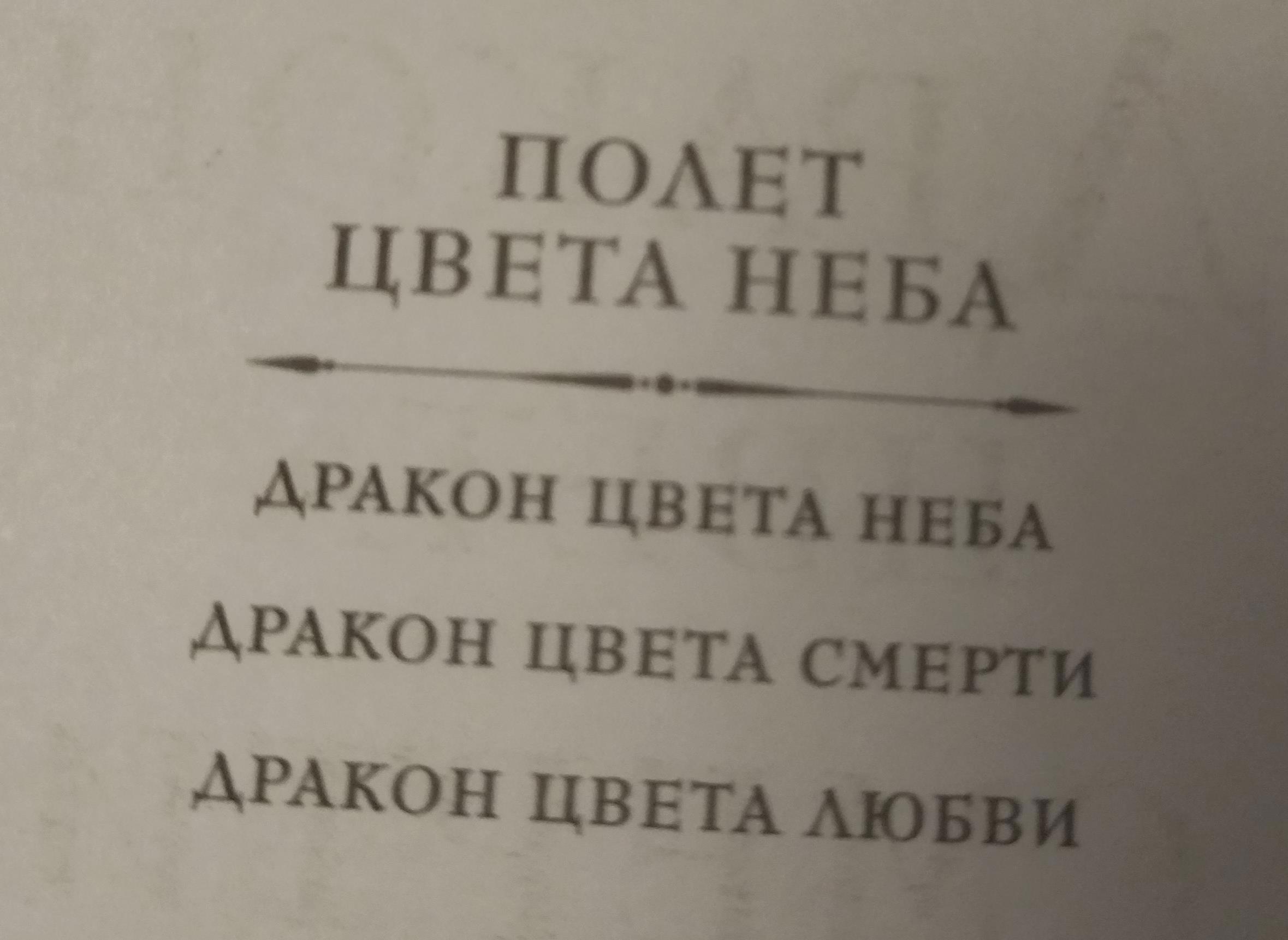 И можно вопрос первая книга- дракон цвета крови, вторая книга - дракон цвета смерти, третья книга - дракон цвета любви. А где дракон цвета неба? Так написано в печатном издании второй книги