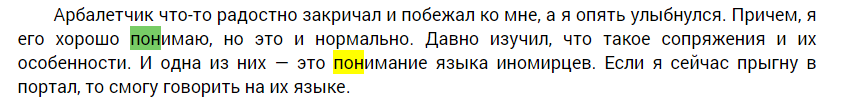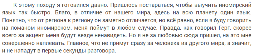 В фрагменте не написано что гг знает иномирский язык, читайте внимательнее. Одна из особенность сопряжения это понимание языка. Язык гг выучил когда пошёл первый раз к артефактору, чтоб местные не приняли его за иномирца. Кстати, автор книги согласен с моим первым комментарием.