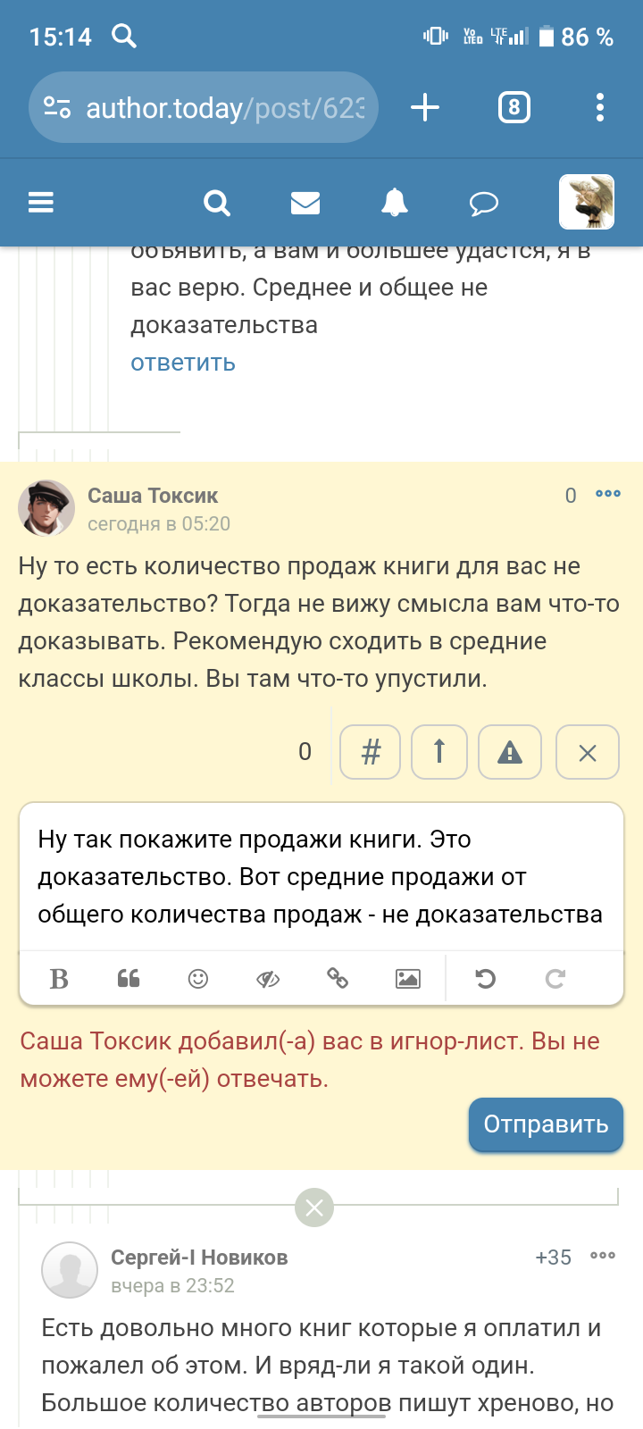 Но может всё же покажете продажи последней книги? Или вторую уже купили 10 тысяч? Просто. В среднем. Минус девять тысяч, это же ужас. Покажите продажи последней дописанной книги. По данным, которые видны читателю отвалилось "9 из 10 посетителей сайта",ох, пардон, 8 из 9.