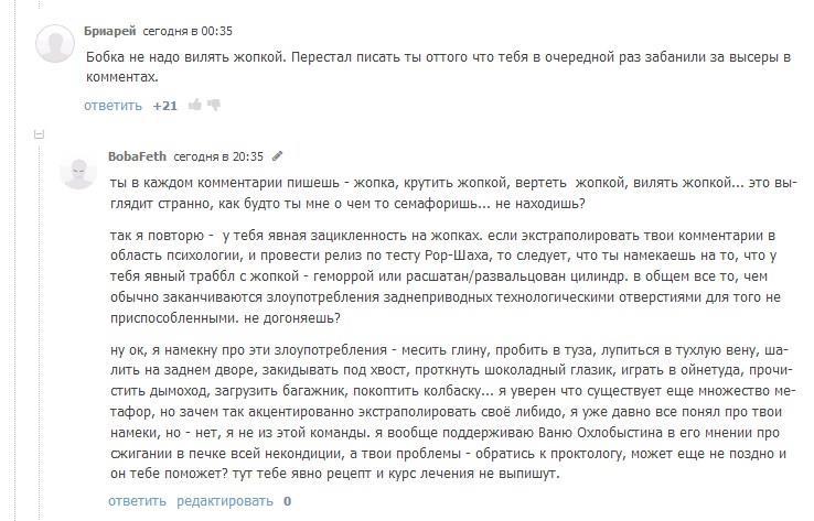 я вообще сильно недоумеваю, почему модераторы ресурса игнорируют оскорбления за которые есть статья УК - ведь призывая менять диллера, он тем самым называет меня наркоманом, это совершенно ясно из контекста, любой лингвоанализ это подтвердит. оскорбляющий не просто не улетает в бан, несмотря ни на что, он на своем визгливом хайпе пока зарабатывает репутацию.