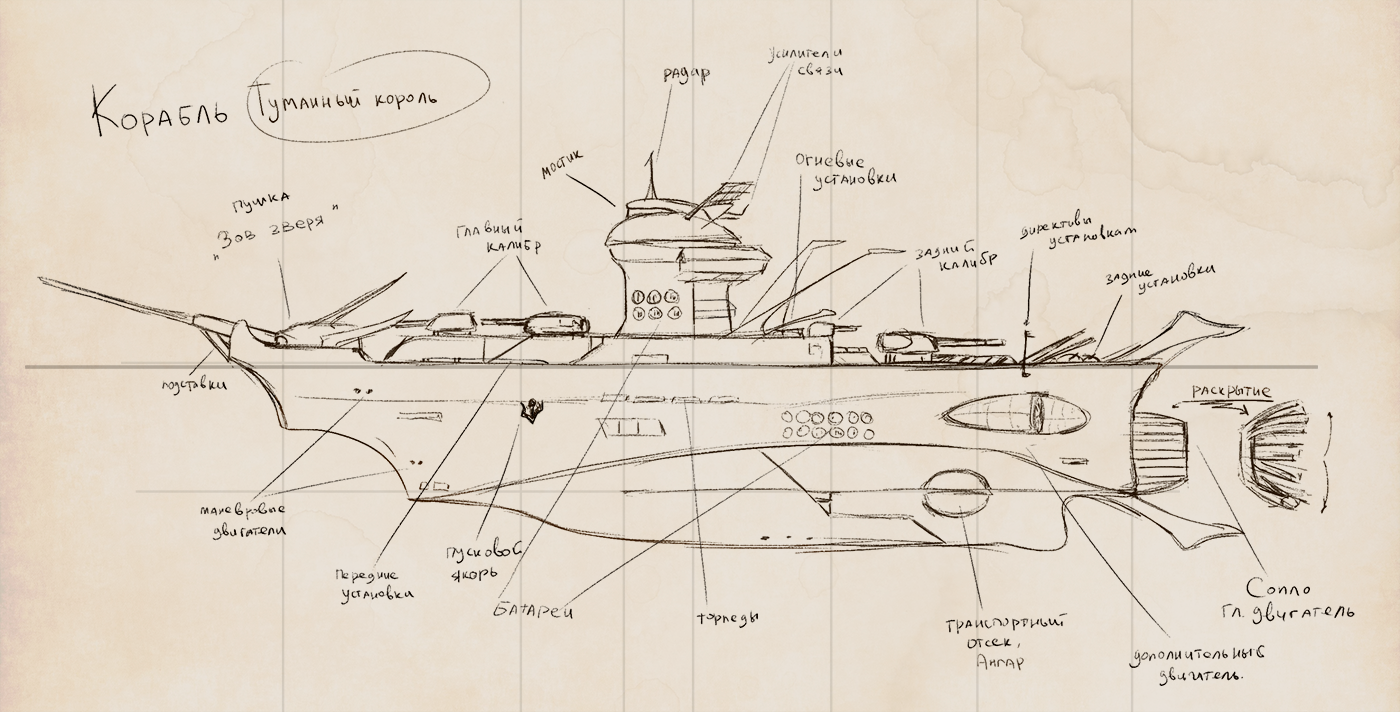 По поводу пушек - да, именно так, но в нашем случае Туманный Король является кораблём поддержки и связи, полностью ориентированным на дальний бой (да и в самой книге указано, что его боевая мощь весьма слабая). Ему не надо быть ёжиком, так как манёвренность и расстояние позволяют как угодно встать к противнику. Для ситуаций, когда враг находится достаточно близко, но вне зоны досигаемости основных орудий (снизу или сверху) есть торпеды и огневые установки, которые выпускают управляемые снаряды.