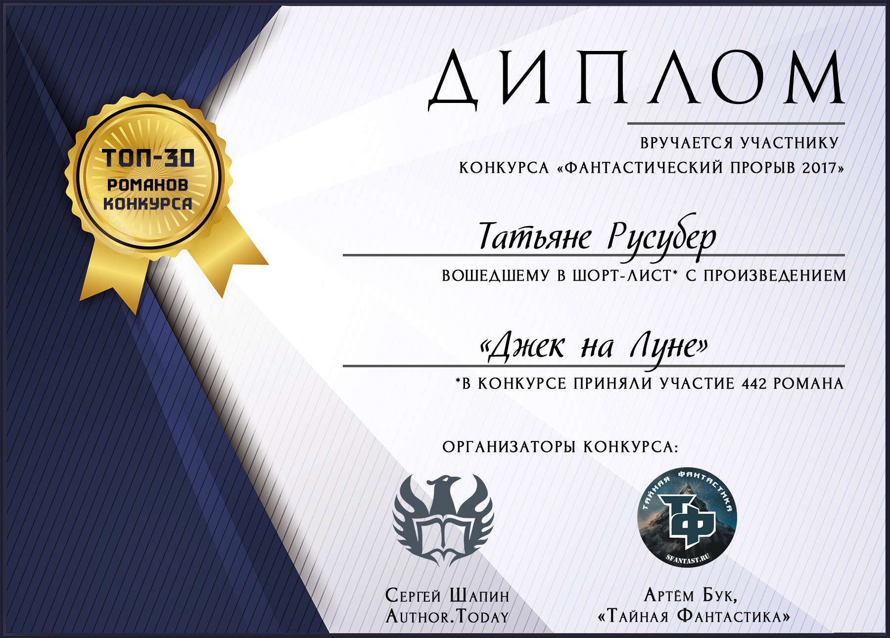 Выдается всем участникам конкурса романов «Фантастический прорыв 2017»