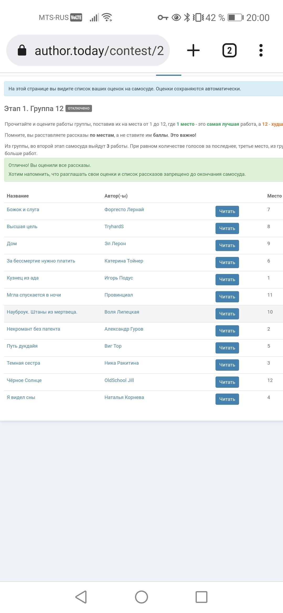 В общем, к чему я всё это пишу. Ребята отнеситесь серьёзнее к этапу самосуда и читайте работы от начала и до конца, даже если они вам не нравяться. Мне повезло, откровенно плохих работ в моей группе не попалось, не соответствующих жанру или слишком мудрённых с ненужными дополнительными линиями повествования - это да. Так что терпения нам всем и удачи.