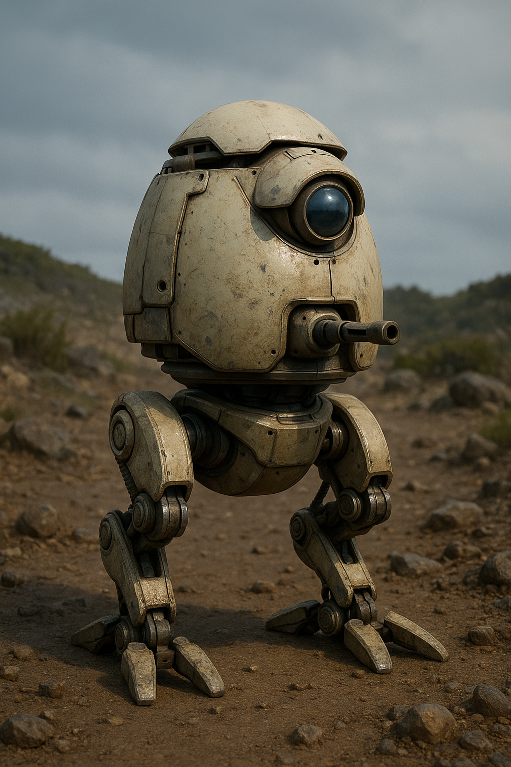 Нижняя часть овального тела является основой, там реактор и двигатель. Верхняя может двигаться на триста шестьдесят градусов. Там скрыты датчики, камеры, пулемёт и боеприпасы.