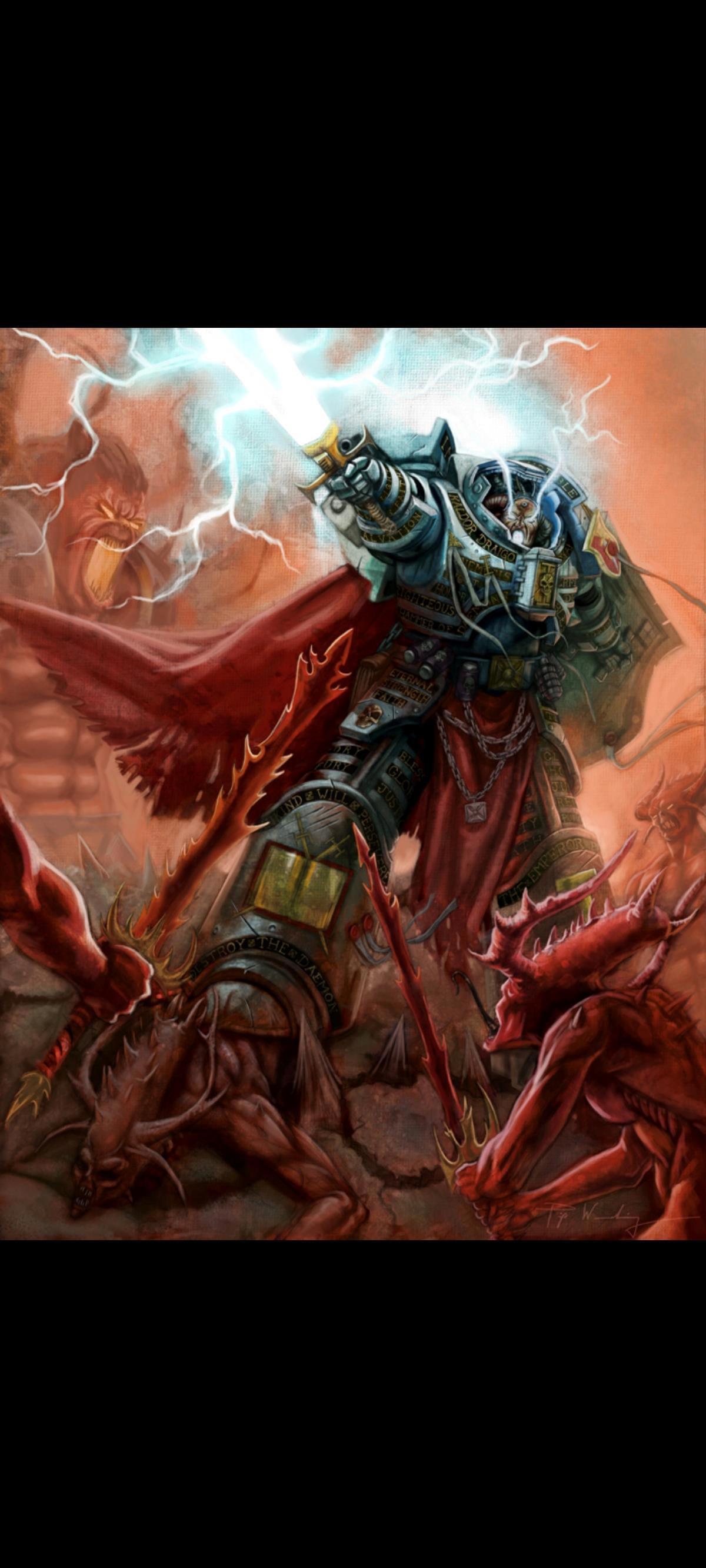 Вперёд вышел человек, вернее, ходячая крепость в латах цвета потускневшего золота и багровой стали. Его лицо скрывал шлем-череп, а плащ инквизитора создавал едва заметную мерцающую сферу и едва уловимо гудел. За ним выстроилась его свита — безмолвные сестры-битвы вооруженные освященными болтерами, другие же держали в руках тяжелые флеймеры их лица озарены фанатичной верой.