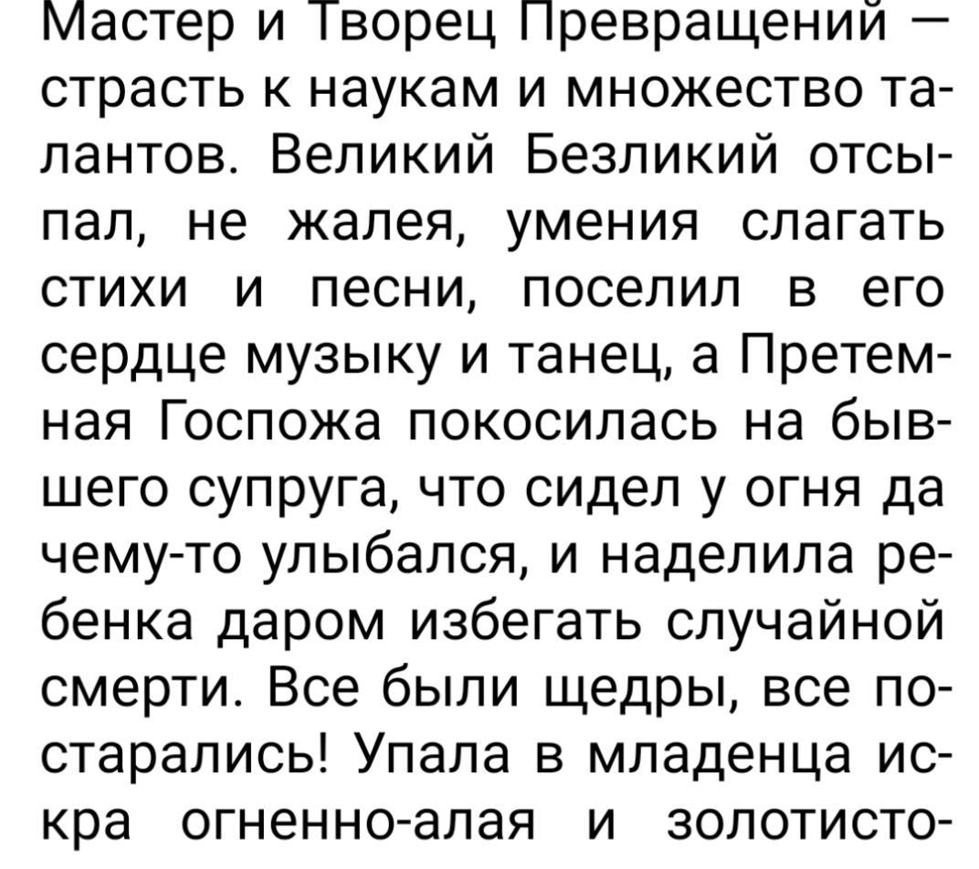 Да вообще счастья у девочки в жизни не было, краткий момент и все. Детство с маменькой не айс, в академии куча подлянок, хорошо хоть вороны были, но с ними по сути уже разошлись, все выросли. Ребёнок случайно появился, ни академии, ни радости материнства. А теперь и это. Я расстроилась совсем, 10 дней так ждала, а уже и ждать не хочется. Но я все таки надеюсь на что-то. Тем более одного ребёнка для планов Баргота маловато и ненадёжно