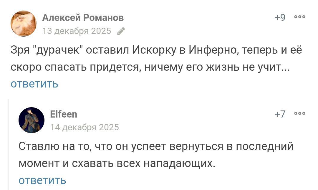 Зря "дурачек" оставил Искорку в Инферно, теперь и её скоро спасать придется, ничему его жизнь не учит...