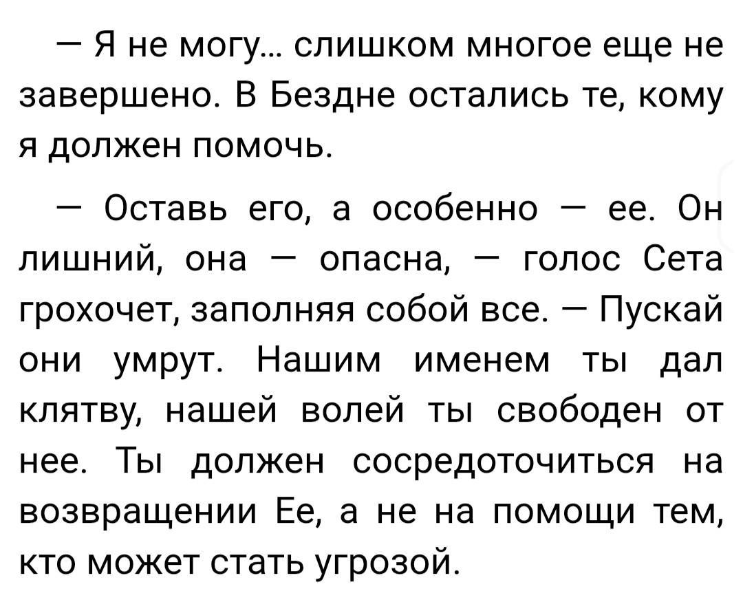 Специально перечитал, возможно многоуважаемый автор опустил момент, ЧЬИМ именем были клятвы принесены по заключённой сделке по закрытию Огненных врат Бездны. Это могли быть как и Змеиные Боги, так и Смеющийся Господин. К тому же в прямых интересах нага, чтобы все прошло успешно. И лишний раз привлекать внимание змеиных богов, он и сам не желает. Поэтому можно и исходить из факта , что есть вероятность что гарантию исполнения сделки Сет и Сеттис сняли именно по освобождению Неи.