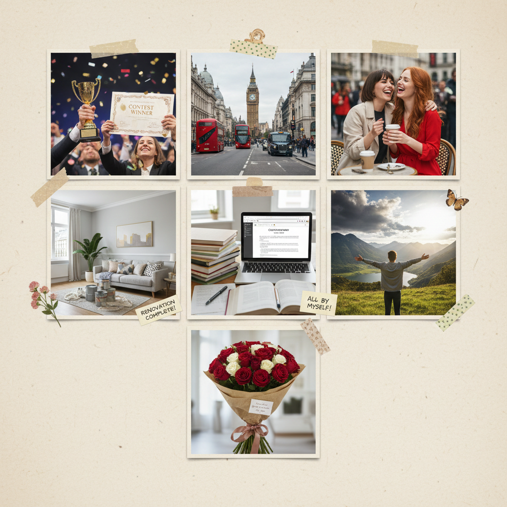 Сделай Эстетичный коллаж, состоящий из семи отдельных квадратных кадров одинакового размера: 1 — [победа в конкурсе]; 2 — [ главная улица Лондона]; 3 —[встреча с подругой (с Астой)]; 4 — [законченный ремонт]; 5 - [курсовые написанные самостоятельно]; 6 - [победа над депрессией]; 7 - [побольше подаренных букетов]. Внешность людей европейская. Стиль: в стиле журнала, мягкий контраст. Добавь разные предметы по теме как во время Скрапбукинга.