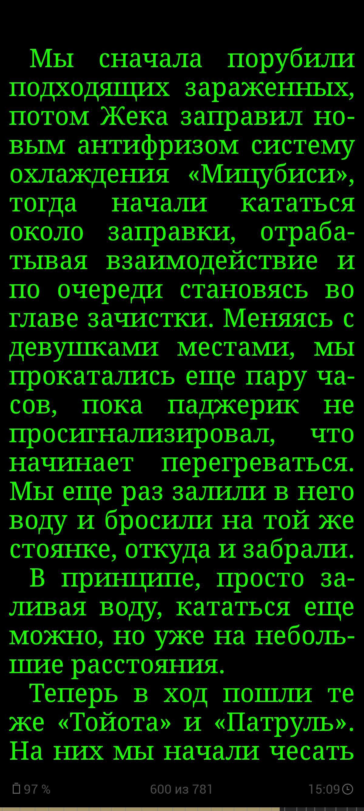 Приветствую! Пока дочитал только до 7 главы есть информация к сведению по патронам которых "врятли у кого и сотня есть" ну как бы нынче времена такие, что есть такие категории вооружённых граждан - охотники на картон и спортсмены патроны запасаются по акциям и распродажам вот как-раз таки от сотен до тысяч, особенно спортсмены стрелки. Патроны дробовые прекрасно работают на коротких дистанциях как пуля ибо вся дробь летит малым пучком и передаёт энергию в очень ограниченный пятачок тела и делает дыры в теле и отрывает (ну почти) конечности. При вандальной доработке патрона с дробью вся дробь летит не далеко и не точно но одной кучкой упакованной в верхнюю часть патрона.