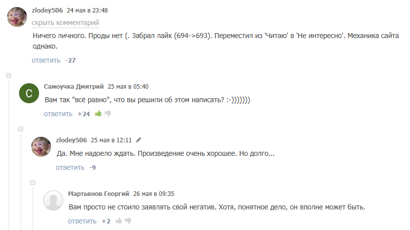 Очень хотелось всё и сразу. А автор писал долго. Морковки не было, а маленький вредный колышек получился (или не получился, да и минусов мне тогда накидали много за комментарий).
