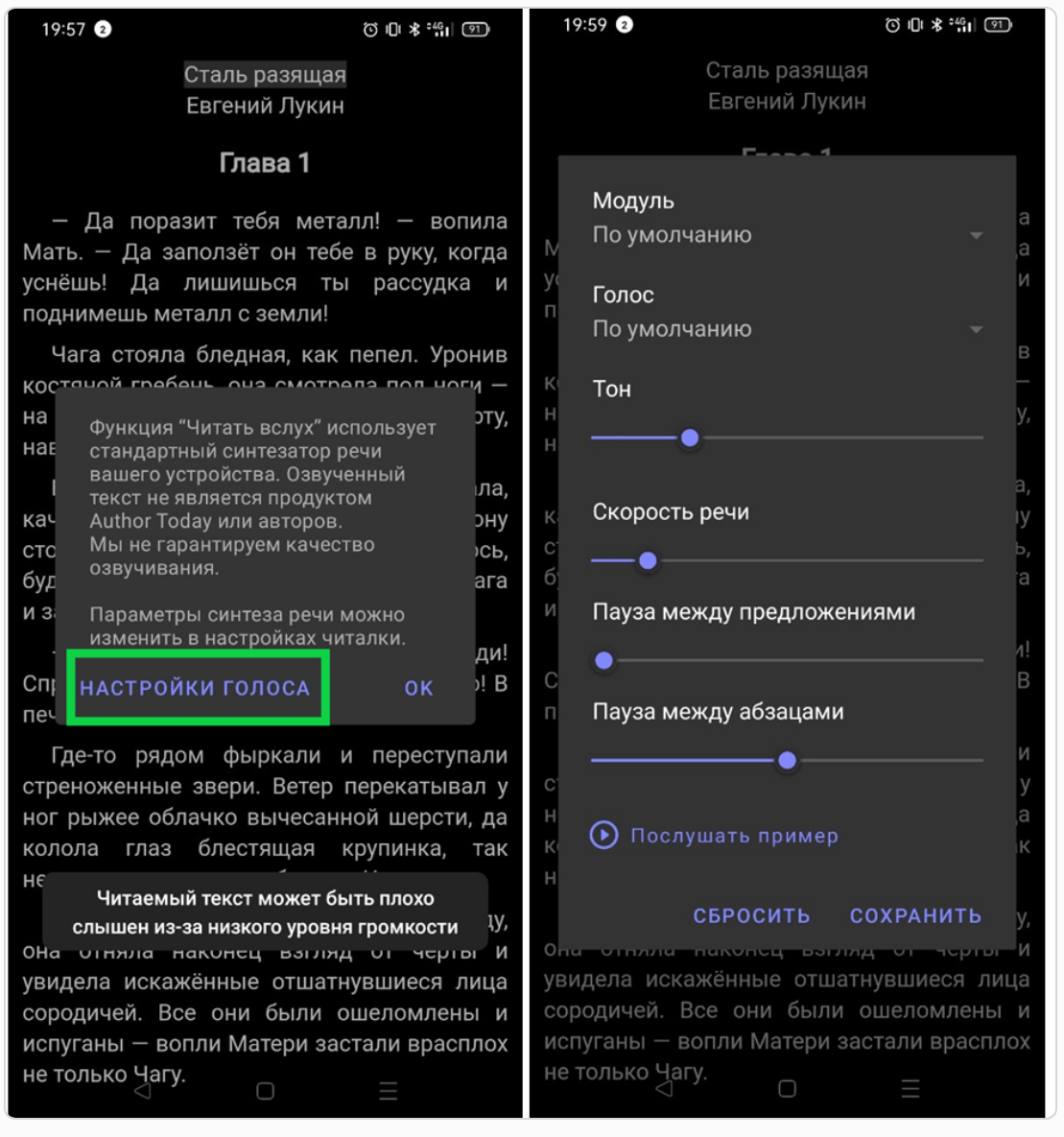 В приложении доступна функция TTS, подключаемая к каждому произведению на усмотрение автора. Если она подключена, на верхней панели вы увидите значок наушников: