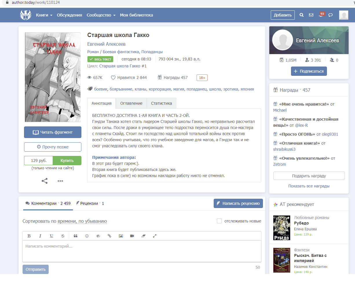 Итак, что я вижу как среднестатистический читатель на страничке книги? Вижу тег первая книга. Вижу размер книги, который чутка больше стандартного. Вижу в аннотации: первая книга бесплатно. Вижу невнятную подпись от автора: Вторая книга будет публиковаться здесь же ( что может подразумевать что угодно, например: на этом сайте). Вижу ценник за книгу.