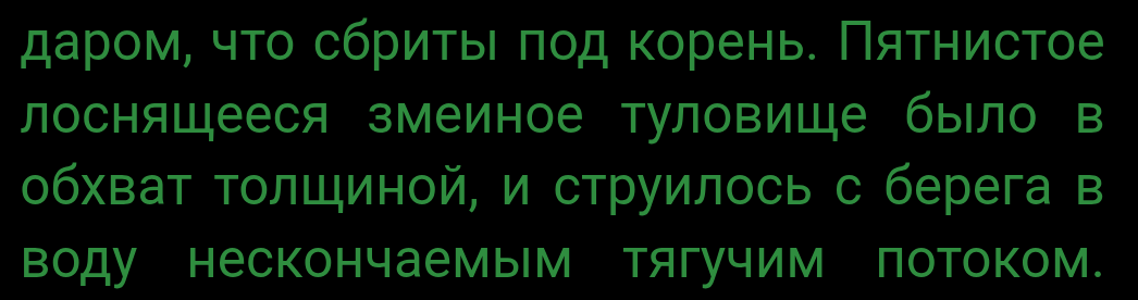 Чтение далось мне непросто: взгляд часто «соскальзывал» со строк. Вероятно, из-за длинных перегруженных предложений - они иногда растягиваются на несколько строк, и мысль в них теряется. Ещё есть ощущение, что тексту не хватает чётких акцентов: важные моменты как будто тонут в потоке прилагательных и образов.
