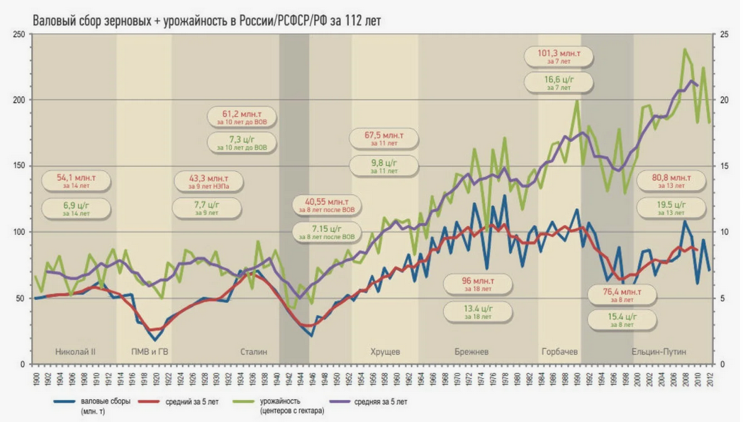 Любопыино, причем тут пассаж про падение урожайности при большевиках и ликвидацию ростовщичества (кулачества) в деревне?:) причем период выбран 15-49 годы как раз ровно включающий два провала разрухи ПМВ и Гражданской и ВМВ и нескольких лет после:) потому , что стоит чуть сдвинуть, на год-два рамки и опять эти проклятые большевики показывают рост:))