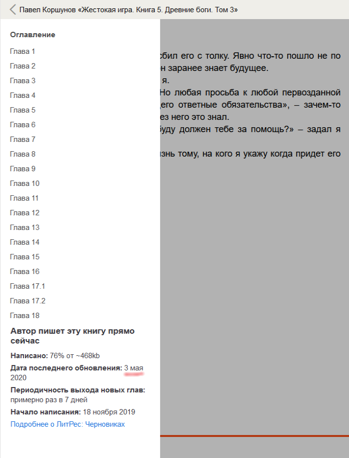 Написал комментарий к произведению Жестокая игра (книга 5) Древние боги (том 3) на ЛитРесе 19 главы так и нет...