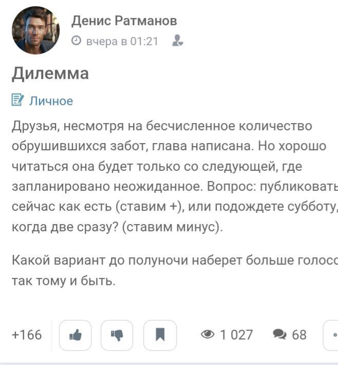 Автор писал на своей странице. Кто читал, те знают. Мы проголосовали, что в субботу выйдут сразу две главы. Не переживайте, всё нормально.
