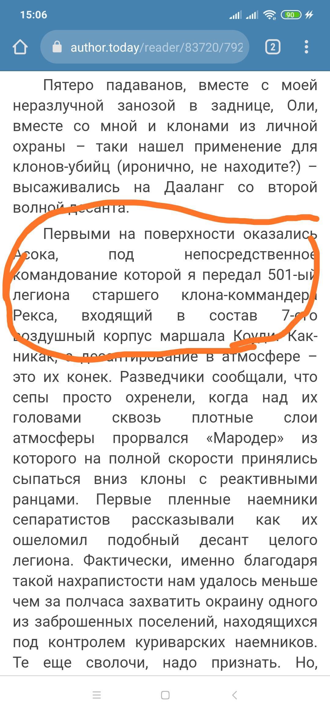 В 35 главе проблема со склонениями, скорее всего вы писали тут в спешке. Мне кажется правильней было бы написать :" Первой на поверхности оказалась Асока, под непосредственное командование которой я передал 501-ый легион старшего клона-коммандера Рекса, входящий в состав 7-го воздушного корпуса маршала Коуди