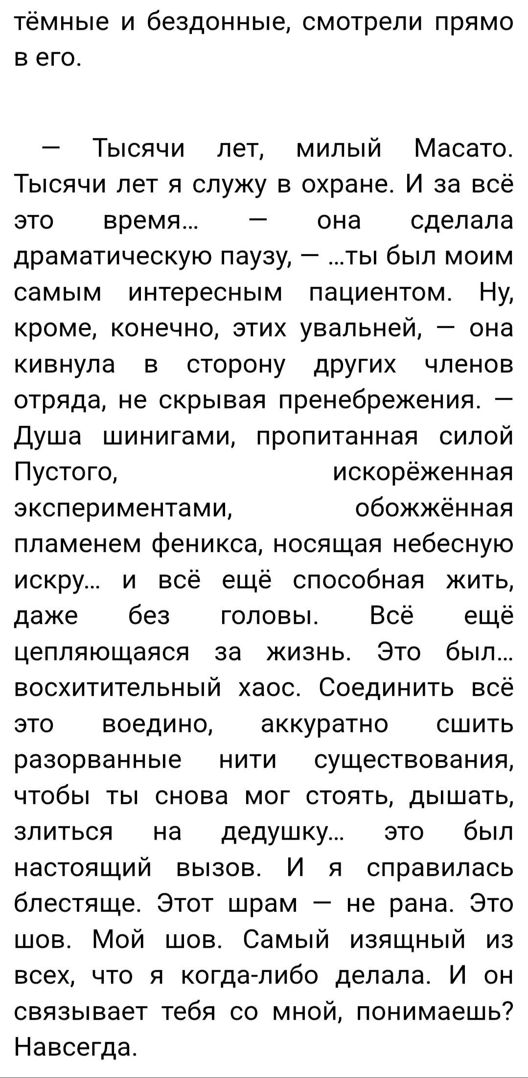4) Хех, ну извините, я не мог всё время оставлять ГГ трусом, нытиком и наивным шинигами. Радуйтесь, что это хотя бы не Попаданец с знанием всего канона, системой и гаремом из всех женских персонажей.
